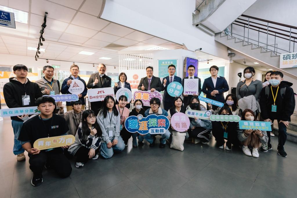 ▲桃竹苗分署賈桃樂學習主題館第九座分館,今(21)日於國立清華大學揭牌,由勞動力發展署署長黃齡玉(後排左5)清華大學詹鴻霖主任秘書(後排左6)及新竹市林琨瀚副市長(後排左3))桃竹苗分署長賴家仁 (後排左4)等貴賓,與青年朋友一同合影。(圖/桃竹苗分署提供)