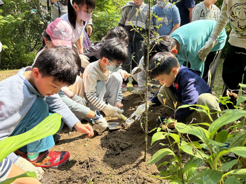 透過解說與互動,引導學生認識每棵樹背後的生態價值,以及適地適木對於生態系穩定的重要性,建立正確的保育觀念。再由學生分組種下臺灣三角楓、青楓、光蠟樹及土肉桂等原生樹種,在校園種下守護山林的樹苗,象徵從在地扎根,讓保育行動深植校園,培養面對環境變遷的韌性力量。