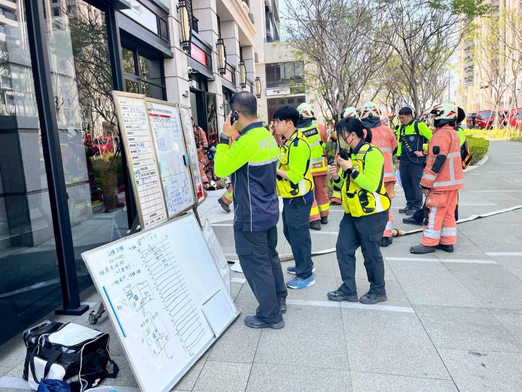 ▲竹市消防局辦理高樓建築物實地演訓,大樓外部設置管制站,管理大樓及入室消防人員相關資料。(圖/竹市府提供)