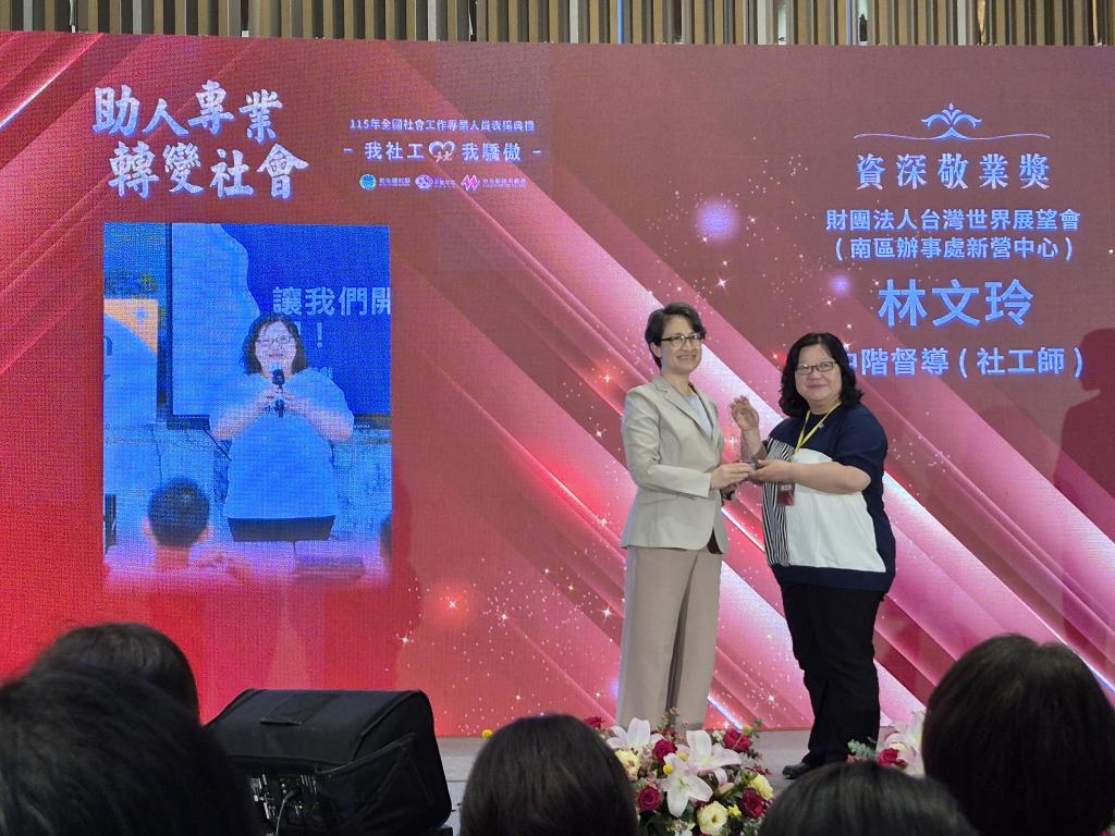 世界展望會南區辦事處新營中心林文玲社工督導,社會工作年資已達31年,獲頒「資深敬業獎」,她於兒少保護、婦女服務、高風險家庭支持及經濟弱勢家庭輔導等領域深耕多年,並參與多項研究及培育大專院校社會工作實習生。