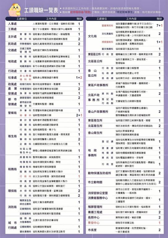 青發中心表示,今年工讀期間自7月1日至8月31日,開缺單位包含青年發展中心、產業發展處、都市發展處、警察局、衛生局、文化局、區公所、動物園、動保所及長照中心等37個單位,共招收103名,其中一般生96名、特定對象7名。每日工作8小時,月薪29,500元。採線上報名(請至數位申辦平台申請 https://reurl.cc/j6l7DL )。