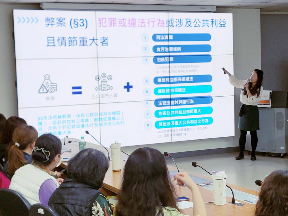 此外,柯宜君主任則針對「公益揭弊者保護法」進行專題講授,說明揭弊制度的設計理念、法律依據及相關保障措施,讓同仁了解在發現不法情事時的通報機制與權益保障,進一步營造勇於揭弊、共同守護廉政的職場文化。