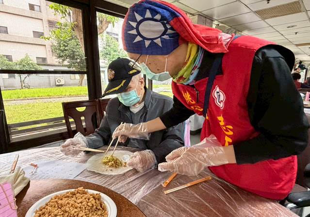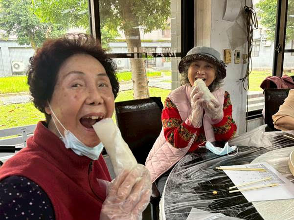 此次活動特別由桃園市榮民服務處榮欣志工到場協助,貼心陪伴行動不便的住民參與製作過程,從備料、鋪餅皮到捲製完成,皆細心引導與協助,讓每位長輩都能安心體驗手作樂趣,不因身體狀況而錯過節慶的喜悅,志工們親切的互動與關懷,也為現場增添更多溫暖與感動。