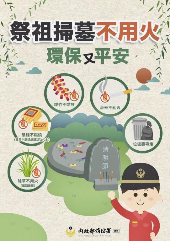 消防局呼籲,民眾在清明祭祖慎終追遠同時,也別忘落實火災預防工作,多加利用市府各項便民服務措施,以「不用火」的方式誠心祭祖,讓掃墓更安心、防災更到位,共同守護生命財產安全。