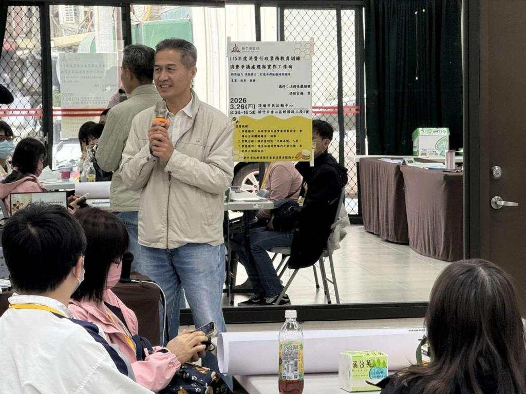 ▲竹市府消保官辦公室辦理「115年度消費行政業務教育訓練—消費爭議處理與實作工作坊」,消保官劉興振代表市長高虹安問候現場參與民眾。(圖/竹市提供)