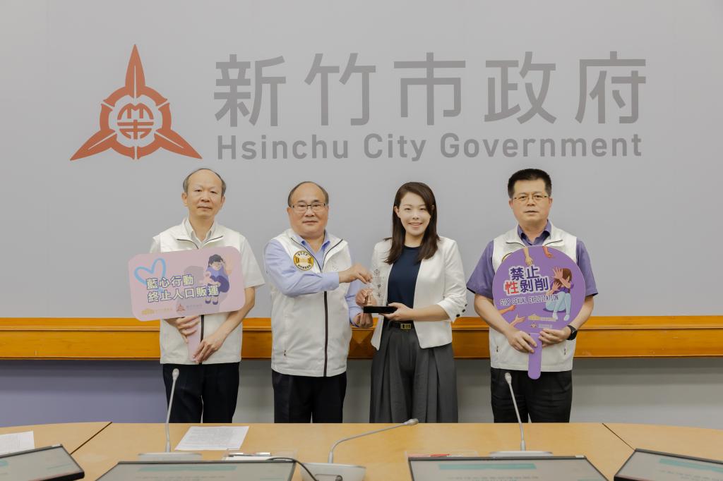 新竹市警察局積極查緝人口販運犯罪,成果斐然,日前榮獲內政部警政署「114年執行加強查處人口販運仲介及集團專案」績優機關殊榮。今(4/7)日特於市務會議前公開獻獎,市長高虹安肯定員警長期以來的辛勞與付出,並指出防制人口販運為具高度延續性的重點工作,期許警察局持續與相關單位緊密協作,攜手強化防制作為,共同守護社會安全。