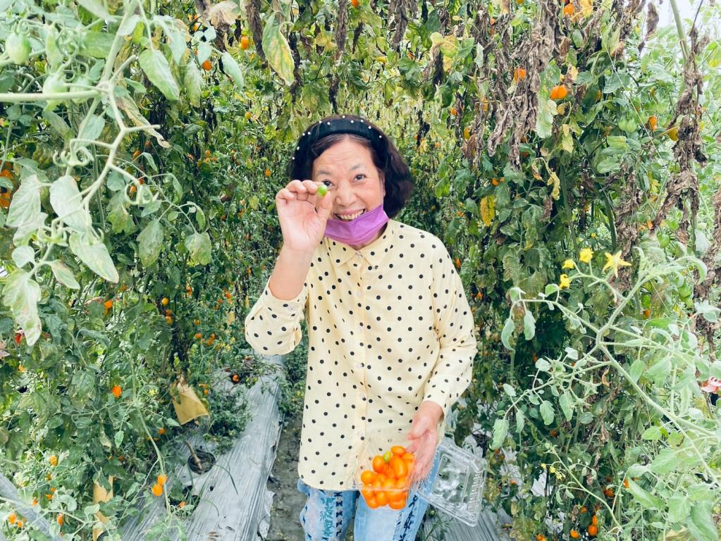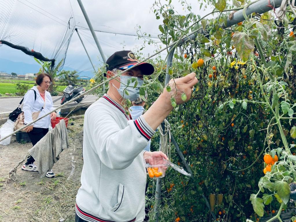 果園內,紅通通與金燦燦番茄交織,宛如五彩小燈籠般掛滿綠色藤蔓;長輩們在照服員陪伴下,化身為專業「採果達人」;他們專注地在翠綠葉片間搜尋那一抹最耀眼的紅與澄亮的黃,伸出微微顫抖卻充滿鬥志的手,輕巧地摘下果實。