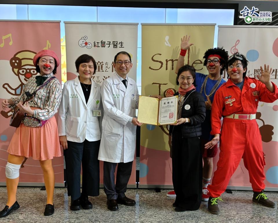 ▲新竹臺大分院蔡孟昆副院長致贈感謝狀,感謝紅鼻子醫生團隊走入醫療現場,陪伴病童並舒緩就醫不安。(圖/新竹臺大分院提供)