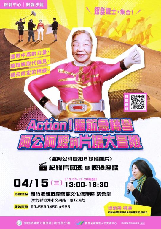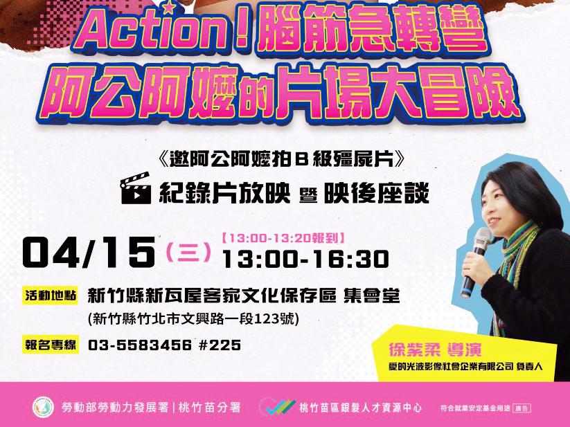 久離職場後想開啟職涯第二春的中高齡及高齡者,時常不知從何開始,勞動部勞動力發展署桃竹苗分署銀髮人才資源中心於4月15日(星期三),在新竹縣新瓦屋客家文化保存區的集會堂舉辦「《邀阿公阿嬤拍B級殭屍片》紀錄片放映暨映後座談」,藉由紀錄片的放映及與導演徐紫柔對談交流,透過真實故事的分享,提升銀髮族群學習與再就業的信心,並激勵更多中高齡及高齡者延續職涯、再展長才。活動採取線上報名( https://forms.gle/PwDbQ7A3eKaUQQfr8 ),歡迎有興趣的民眾踴躍參與!