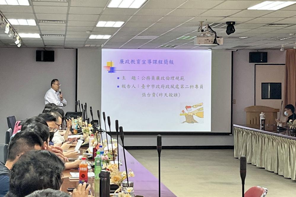 廉政講習的下午場次,則係邀請臺中市政府政風處張台貴專員,講授「公務員廉政倫理規範」及「公職人員利益衝突迴避法」等陽光法案,除就法規重點進行說明外,並透過實務案例與情境式提問,講座中引導與會同仁思考日常業務中可能面臨之廉政風險,輔以有獎徵答方式強化學習效果,現場互動熱絡,整體成效良好,充分展現宣導與實務結合之效益。