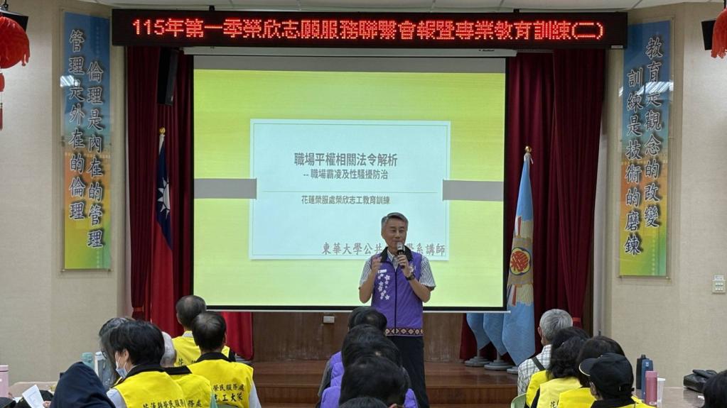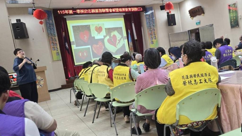 【勁報記者于郁金/花蓮報導】為推展志願服務工作、凝聚志工團隊向心力並提升專業知能,花蓮縣榮民服務處10日舉辦「志願服務專業教育訓練」,同時結合第一季榮欣志工服務聯繫會報辦理,課程內容多元豐富,吸引眾多志工夥伴踴躍參與。