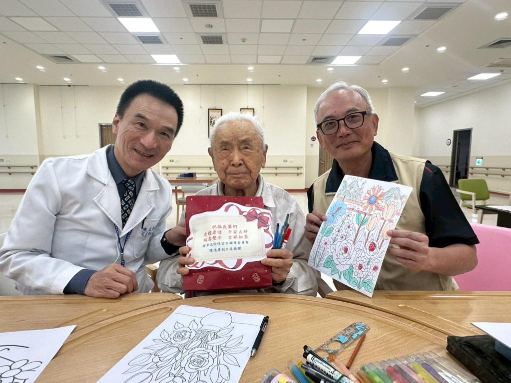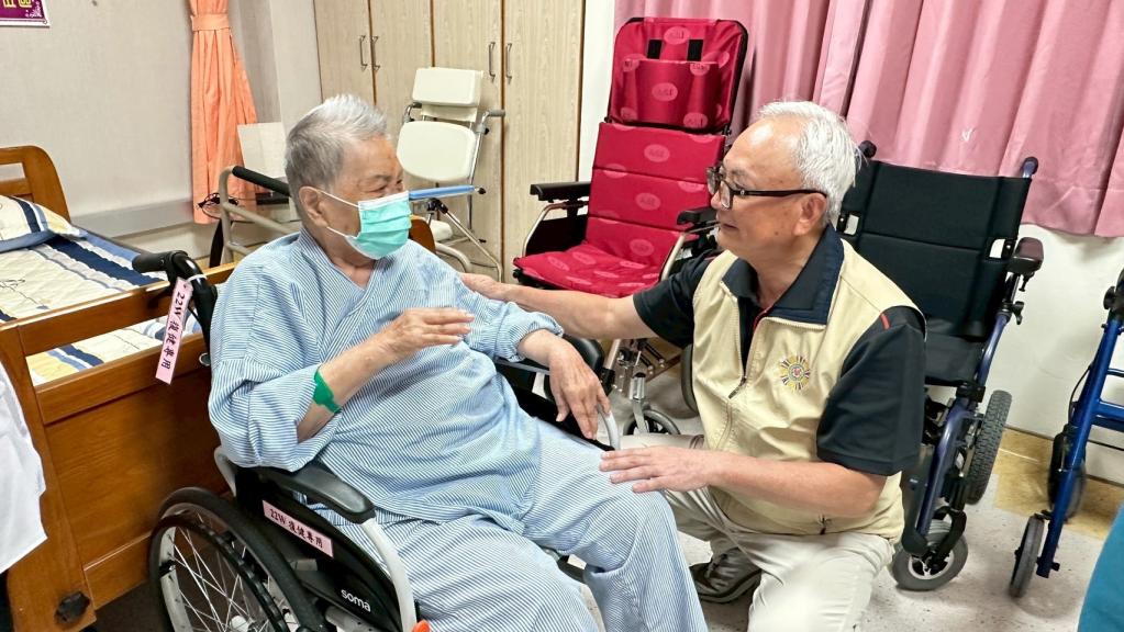 【勁報記者于郁金/嘉義報導】輔導會副主委陳進廣近日率參事陳延芳、王凱珩、就醫處李宣緯副處長、服照處鄭陽光副處長等,在中榮嘉灣分院院長陳正榮及護理部張蘭英主任陪同下,視導走訪臺中榮總嘉義分院,了解醫養合一照顧榮民(眷)執行情形,及「鐵三角照護網絡鐵三角健康照護體系」各單位合作運作狀況;並至長照大樓慰問住院榮民(眷),其中100歲人瑞榮民鄭樹雲伯伯,看到親切和藹陳副主委滿臉笑容,特別與副主委分享平時在護家閒暇畫作,並表達感謝輔導會照顧,住在榮院護家倍受照顧。