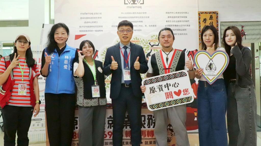 ▲「薪有所玄」2026玄奘大學校園徵才博覽會,原住民族委員會竹苗區原住民就業服務辦公室邱慕庭專員(左1)、林慈愛議員助理樂樂梅(左2)、竹苗辦公室謝銀仙督導(左3)、玄奘大學校長簡紹琦(中)、玄奘大學原民中心張宏年先生及原住民學生合影。(圖/玄奘大學提供)