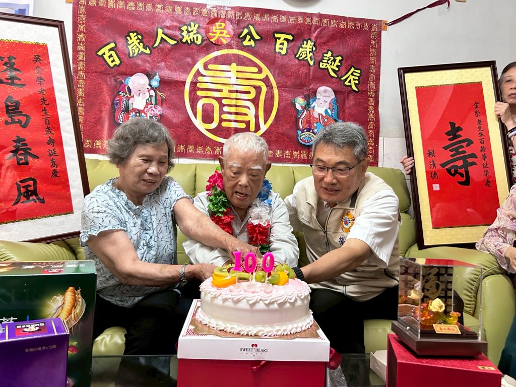 【勁報記者于郁金/臺南報導】榮民吳金榮爺爺百歲紀壽,臺南市榮服處胡思湘處長於16日親率責任區輔導員、榮欣志工、替代役男等團隊同仁,並邀請南紙里王信雄里長等,至榮民吳金榮爺爺家裡舉辦溫馨百歲慶生活動;胡處長代表獻上總統、行政院長祝賀壽屏及轉送輔導會主任委員獻上象徵福壽綿延琉璃壽桃金飾,王里長現場表達誠摯祝福,共同恭賀祝福吳爺爺壽福康寧、至德延年,以表達國家對榮民戎馬一生崇高敬意。