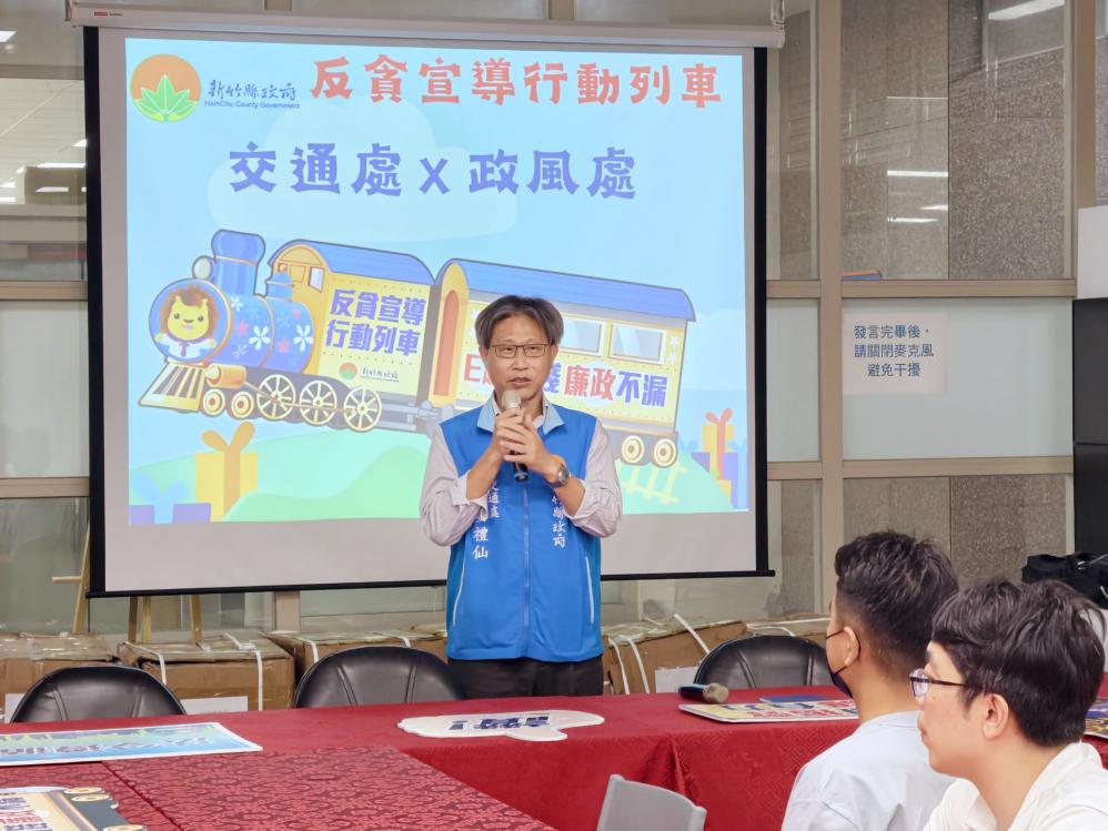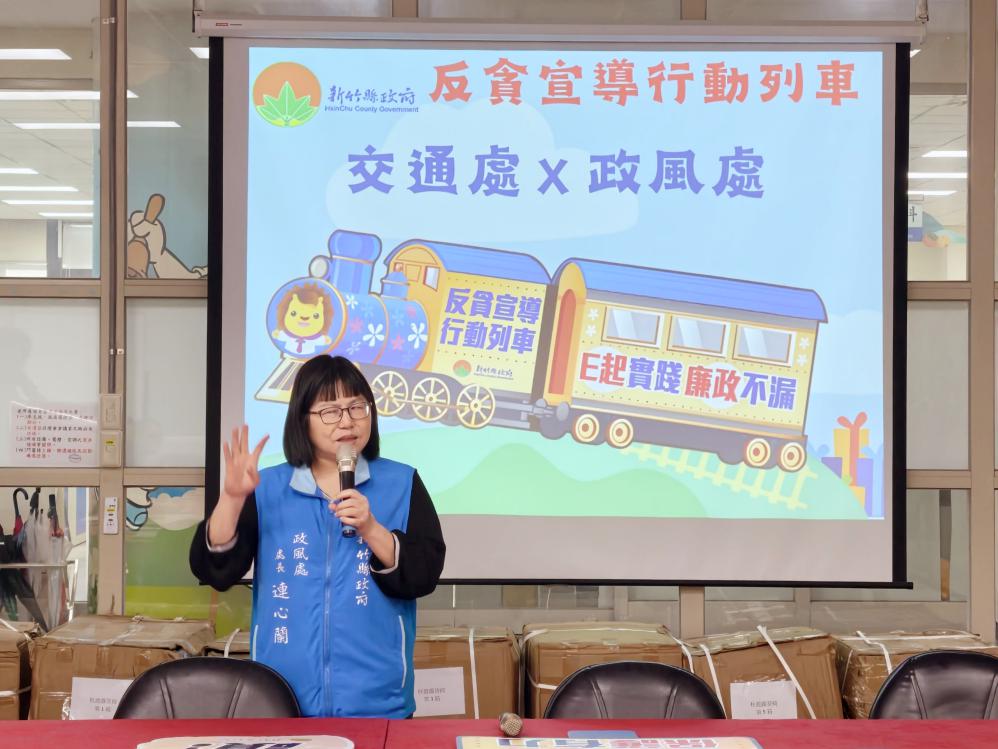 ▲竹縣府政風處推出「E起實踐.廉政不漏」反貪宣導行動列車,4月15日首站停靠交通處,交通處長姜禮仙致詞。(圖/竹縣府提供)