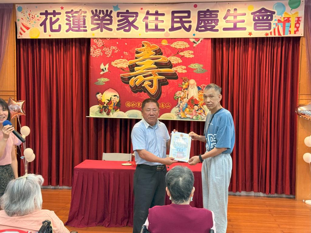 【勁報記者于郁金/花蓮報導】花蓮榮家舉辦4月份住民慶生會活動,長輩們齊聚一堂,現場氣氛熱絡融洽,共同歡慶屬於自己特別日子;此次活動特別邀請花蓮縣米浪律動協會蒞臨演出,由理事長柳茗茵帶領團隊帶來充滿活力與節奏感精彩舞蹈表演,為慶生會增添歡樂氣氛,贏得在場長輩熱烈掌聲喝采,會中並由榮家主任游文勇致贈感謝狀,表達誠摯謝意。