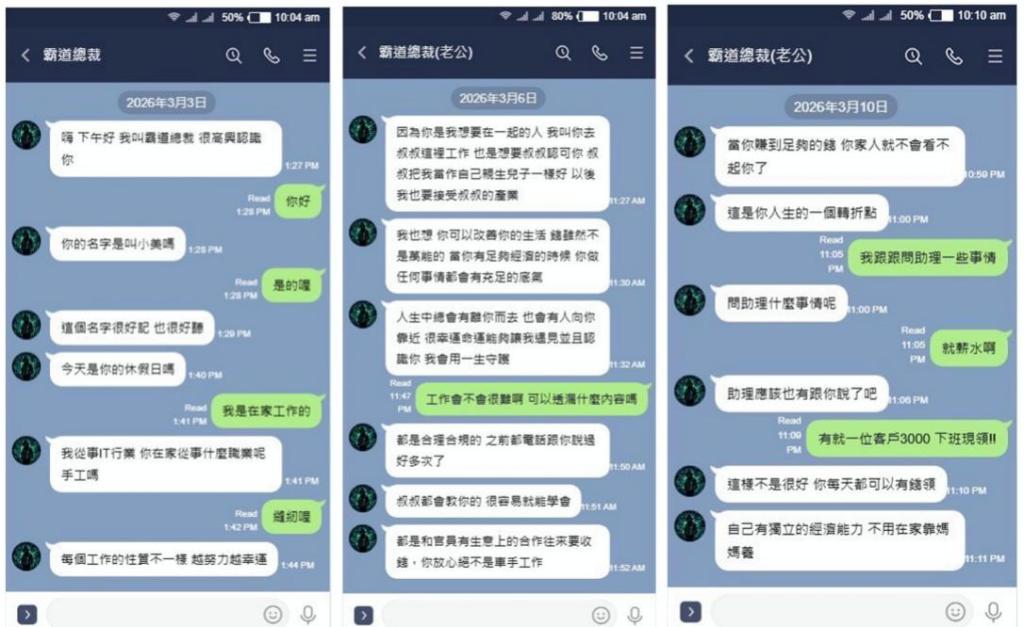 新竹市警察局分析近期破獲案例指出,詐騙集團多半潛伏在抖音或臉書中,當民眾滑到感興趣的對象並按下追蹤後,詐團就會主動私訊、一步步引導聊天,專門針對「有情感需求」的族群,塑造「霸道總裁」或「成功人士」虛假人設博取信任,一旦在聊天過程中聽到民眾抱怨目前工作薪水太少、對現有收入不滿,就會假好心「推薦高薪工作」或「介紹輕鬆賺外快的機會」。部分民眾在詐團心理操控下,受託從事代收款項或面交取款,殊不知已在無形中淪為詐騙金流移轉的關鍵一環,實則已身陷詐團車手之犯罪陷阱。