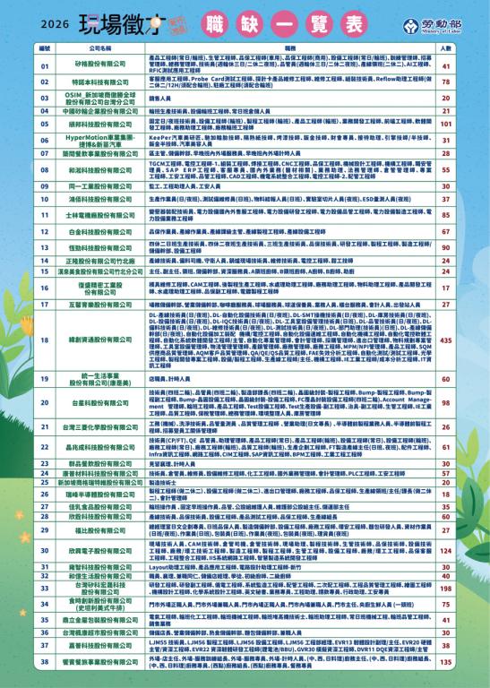 竹北就業中心陳玉秋主任表示,本次活動邀請各產業知名廠商,有台灣矽科宏晟、欣興電子、恆勁科技、頎邦科技、緯創資通、和淞科技、台星科、矽格、欣銓科技、士林電機、築間餐飲、漢來美食、饗賓餐旅及食時創新-史坦利美式牛排等38家廠商。為吸引優秀人才踴躍參與本次徵才活動,多家企業祭出超值福利!矽格提供社會新鮮人預聘獎金5萬元大紅包,另為新進人員提供前三個月車資補助及免費住宿,大幅減輕初入職場的生活壓力;鼎立金屬包裝提供新人就任獎勵金,讓求職者開工就有好心情;築間餐飲提供基層員工平均薪資4萬元,高於主計處公佈餐飲業平均薪資; 漢來美食主打排班彈性、穩定工時、完整教育訓練及透明升遷制度,讓員工可依生活需求調整工作時間,打造更友善的職場環境。豐富福利與彈性制度齊備,千萬別錯過這次就業良機。想了解更多廠商和職缺資訊,可先至活動網站( https://gov.tw/pTB )查詢。