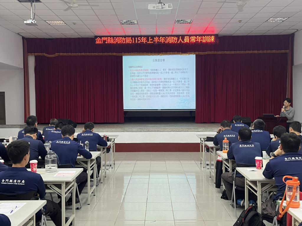 【勁報記者于郁金/金門報導】金門縣消防局為提升同仁廉能意識,落實公務員守法精神,近日結合上半年消防人員常年訓練,舉辦「廉政法規」專題宣導講習,邀請縣府政風處專員吳冠瑩主講,以「公益揭弊者保護法」為主題,說明該法之意涵,使同仁了解只要秉持公義揭露違法或不當行為,均可獲得法律保護,並能有效提升機關內部監督能量,建立公開透明行政環境。