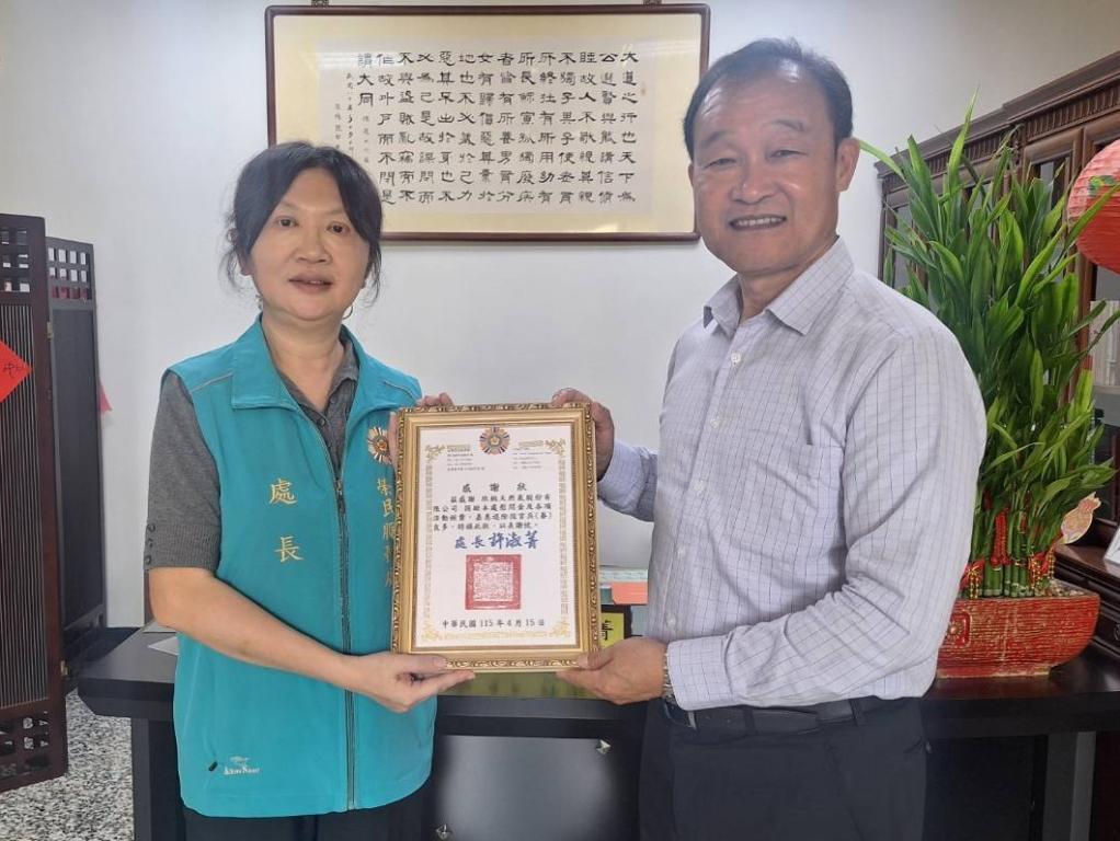 【勁報記者于郁金/嘉義報導】欣桃天然氣公司持續以實際行動,展現企業關懷社會責任與溫度;日前董事長房茂宏特地南下嘉義,親赴嘉義榮民服務處捐贈善款,將愛心資源送到最需要地方;此次捐贈儀式由榮服處處長許淑菁代表受贈,並致贈感謝狀,表達對欣桃公司長期支持與善行義舉誠摯感謝。
