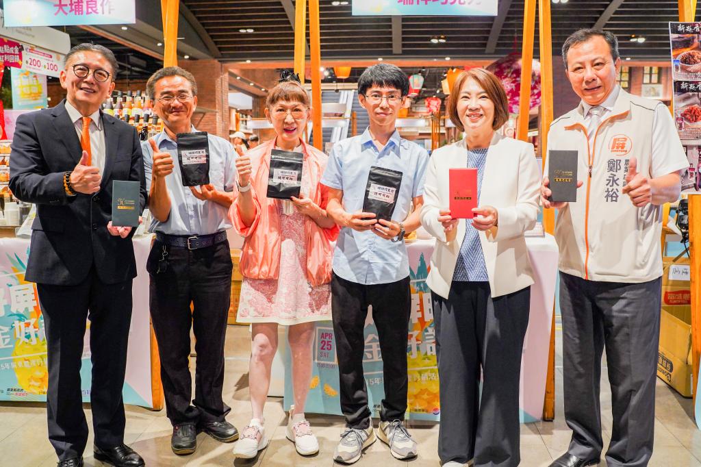 ▲遠東百貨總經理徐雪芳(左3)、屏東縣縣長周春米(右2)和與會貴賓大力向民眾推廣屏東美味特色農產品。(圖/竹北遠百提供)