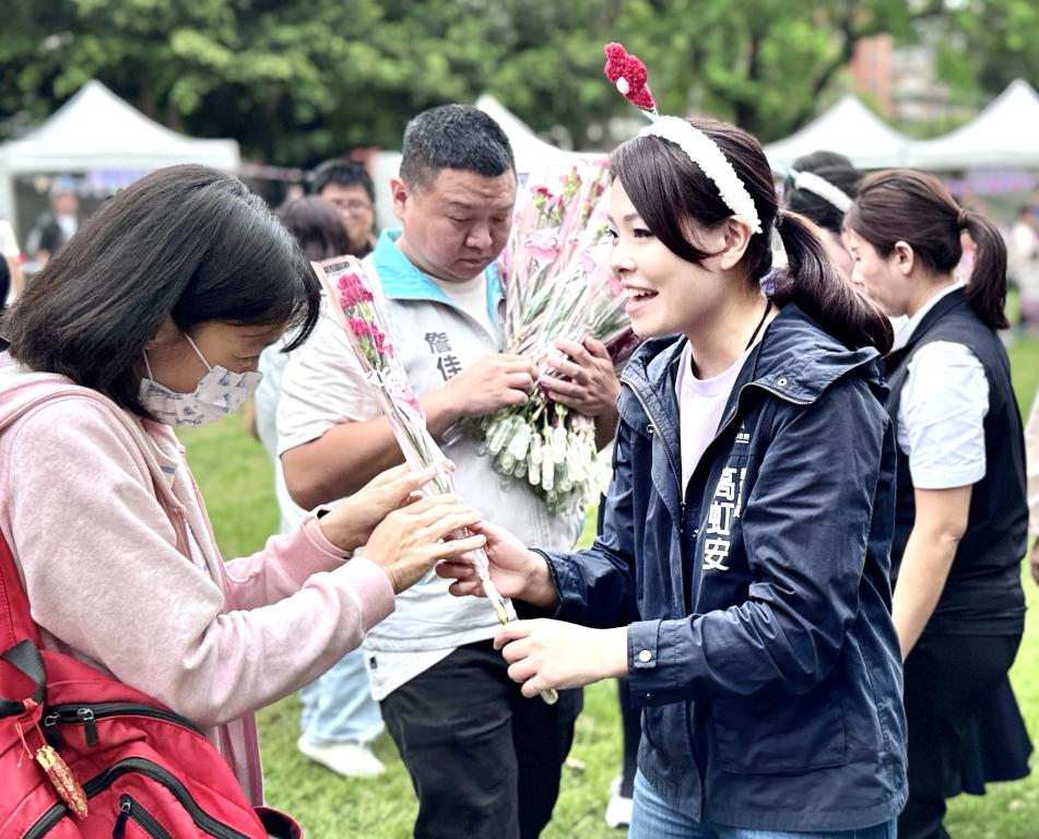 ▲新竹市「童享健康.安全童樂」第二場於北大公園熱鬧登場,市長高虹安到場與市民朋友同樂,並於現場親送親自送上康乃馨給親子提前祝福市民母親節快樂,現場互動熱絡且笑聲不斷。