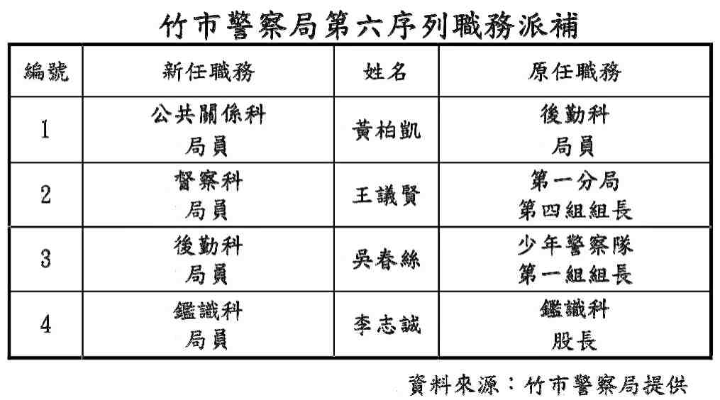 竹市警察局表示,經依相關適任人員之品德操守、專業能力、工作表現、職務歷練等通盤考量,期使各員適才適所,發揮所長,提升維護治安量能。竹市警察局此次調整人員共計26員,將於統一於115年4月30日辦理交接到任。