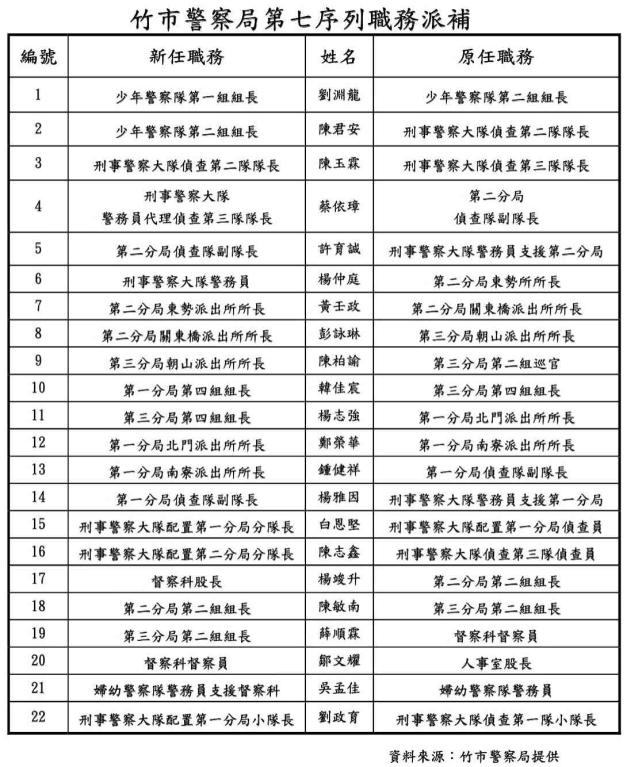 ▲竹市警察局發布該局第七序列職缺檢討派補名單。(圖/竹市警察局提供)