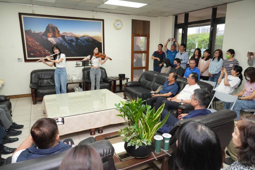 ▲五一勞動節前夕,竹縣警察局舉辦「驚喜式」慰勉活動,首度開放平日進出嚴謹的「局長室」,更安排現場小提琴與長笛演奏。(圖/竹縣警察局提供)