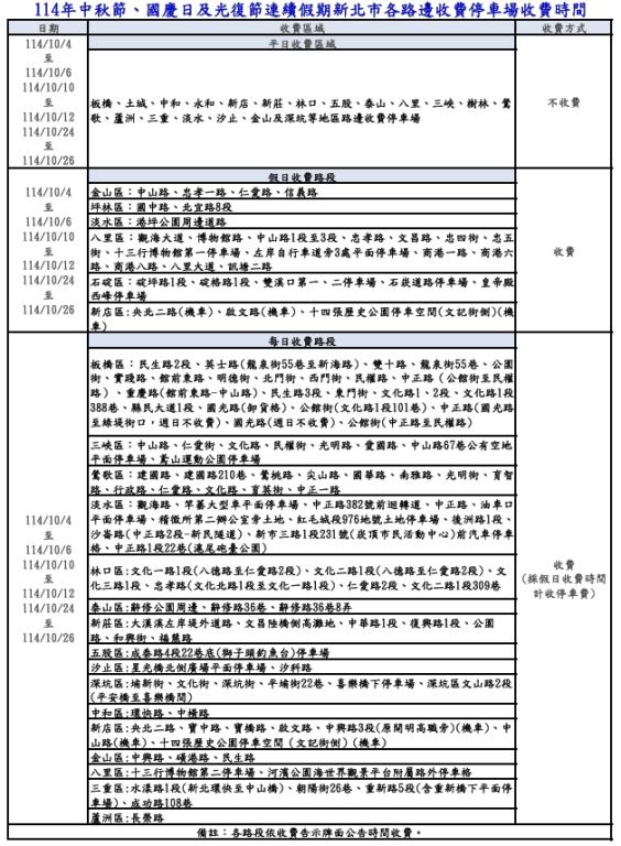 (勁報記者胡光輝/新北報導)新北市交通局表示,今(114 )年10月計有中秋節、國慶日和光復節等3個連續假期,連續假期間新北市路邊汽、機車平日收費停車格將暫停收費;板橋府中商圈、金山、深坑及鶯歌老街等觀光及商圈區域假日收費停車格則維持收費,請駕駛人停車時多加留意。