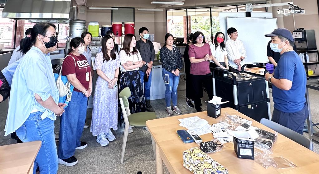 圖說:新北特校餐飲科貝仁貴老師向法扶律師們說明透過職務再設計,讓每位學生在製作咖啡包。