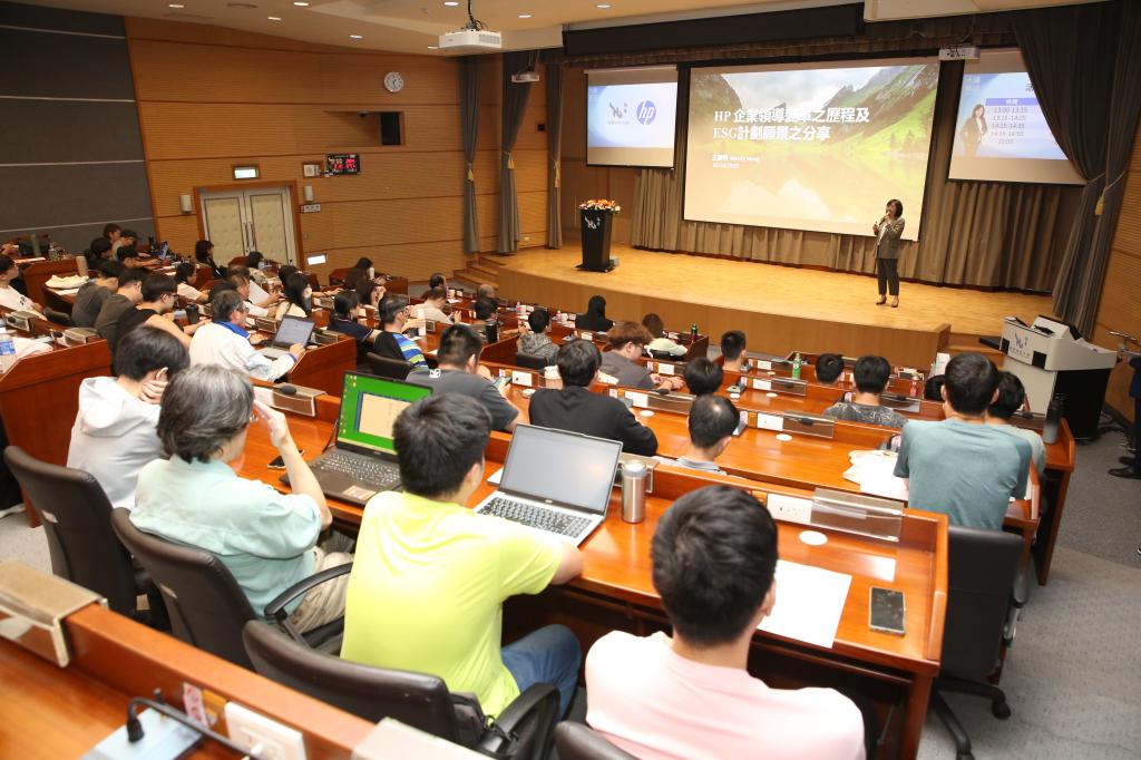 圖說:惠普資訊董事長王靜秀於龍華科大分享組織變革與ESG實踐,現場座無虛席。