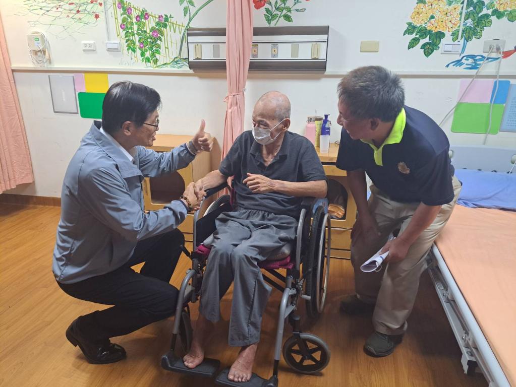 江伯伯見到嚴主委時情緒激動並有感而發表示,自己有幸於住所嚴重淹水情形下獲救,並獲得即時關懷及安排入住榮家照顧,非常感謝輔導會服務照顧。