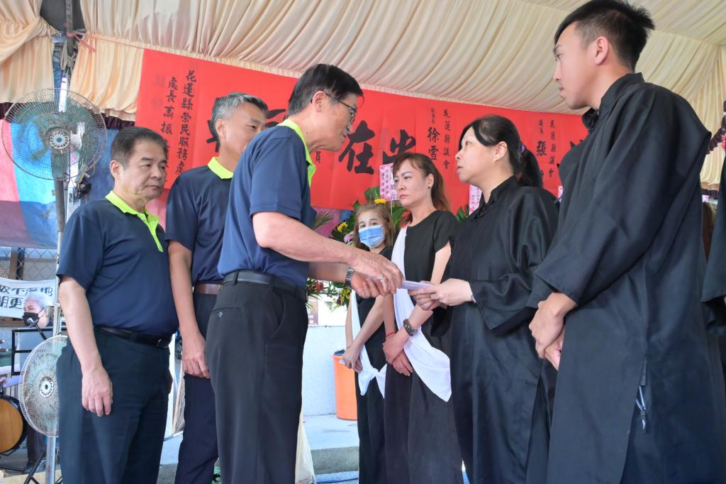 3日一早馬不停蹄趕赴鳳林鎮第一公墓參加罹難遺眷林女士公祭,並致送家屬10萬元慰問金,關心家屬目前需協助生活及受災住家復原情形;隨後一行直奔光復鄉災區進行退除役官兵及眷屬關懷慰問,發放受災退除役官兵眷每戶2萬元慰問金。