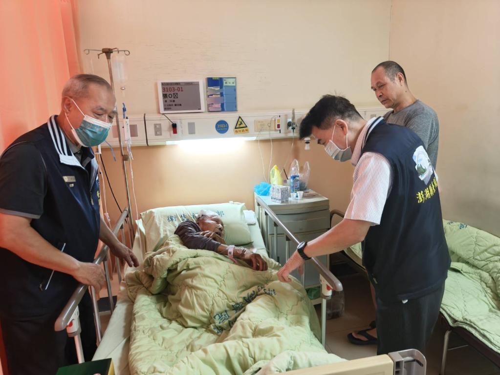 榮服處說明,較需照顧張伯伯夫妻,平日由社區服務組長密集訪視關懷,日前伯伯因車禍緊急送醫住院,榮服處獲悉後,即刻前往醫院慰問;余熙明處長在病床旁悉心問候榮民身體狀況,及關懷照護家屬需求,病床上伯伯雖然不能言語,但感謝表情溢於言表。