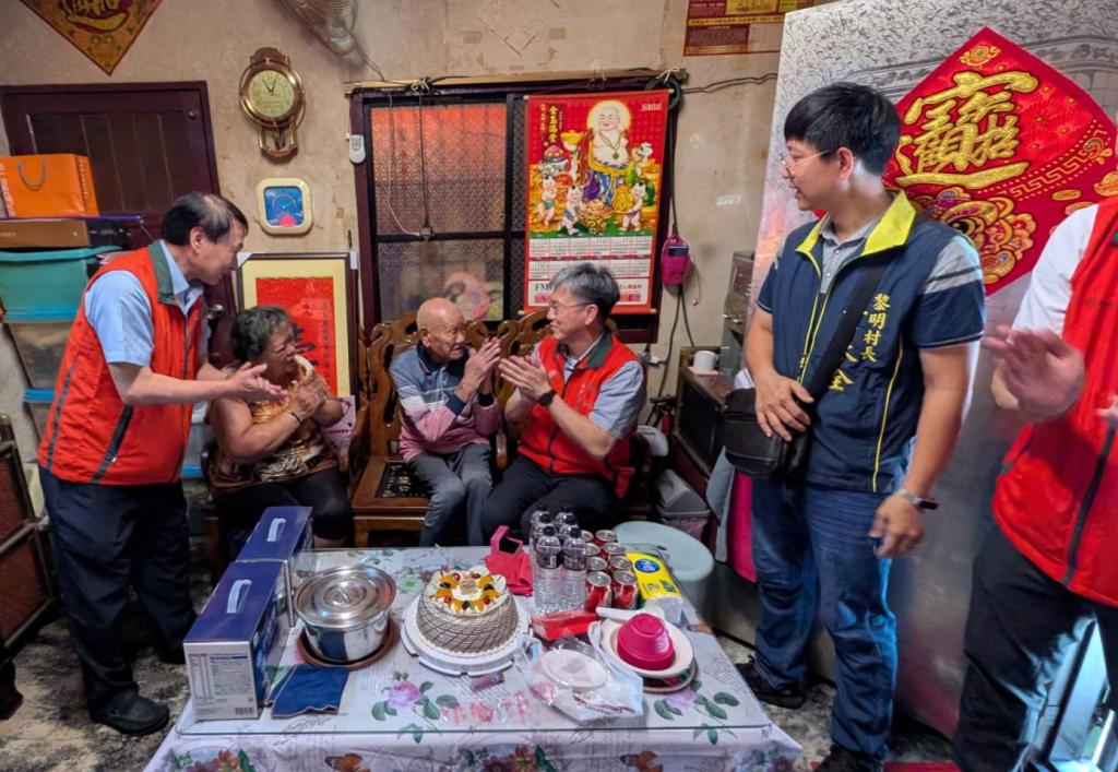 【勁報記者于郁金/屏東報導】內埔鄉榮民人瑞辛玉言爺爺日前歡度百歲壽辰,屏東縣榮民服務處特地前往祝賀,場面溫馨感人;榮服處王德維處長邀請在地黎明村村長黃永全一同參與祝壽儀式,黃村長代表頒贈由總統及行政院長署名壽匾,王處長則親自為辛爺爺戴上輔導會主任委員嚴德發致贈金戒指,表達國家對其奉獻敬意。