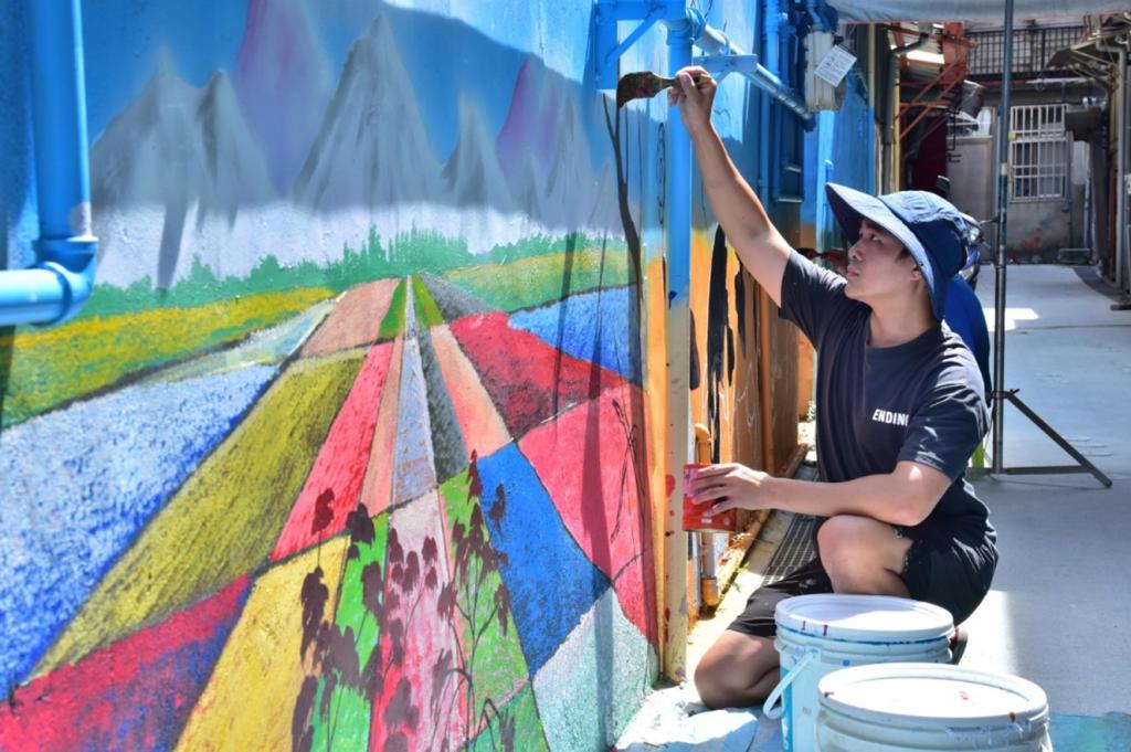▲藝術家於後巷彩繪牆面中。