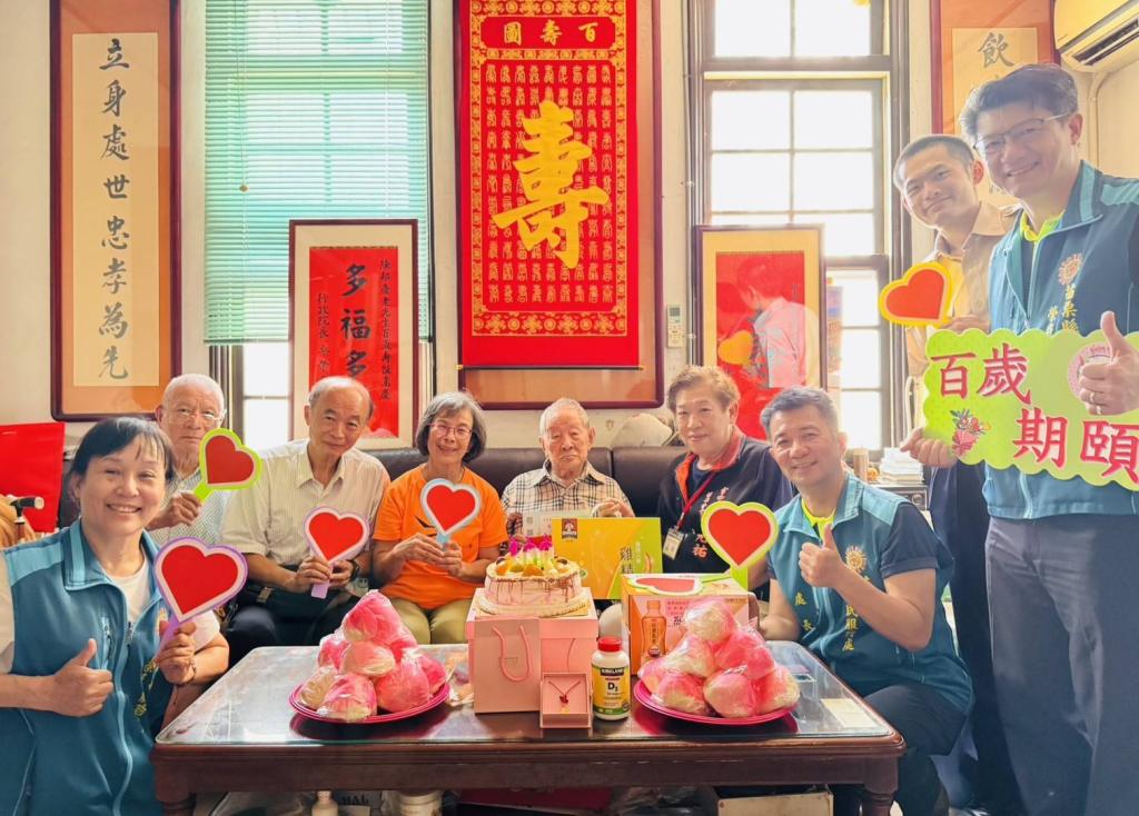 【記者于郁金/苗栗報導】苗栗市榮民陳邦慶爺爺欣逢百歲,苗栗縣榮民服務處處長陳立中率副處長柯長榮及榮服處工作同仁,由處長代總統、行政院長致贈賀歲壽屏及退輔會金飾墜子,準備慶生蛋糕、壽桃及重陽節營養品禮盒,為陳爺爺舉辦溫馨慶生活動,苗栗縣擎天自強協會理事長嚴美蘭、雪中送炭關懷協會苗栗分會長吳光祐到場賀壽,依序致贈祝壽紅包、禮品等,眾人在生日快樂歌、分享蛋糕、壽桃歡欣氣氛,領略感動溫馨生日饗宴。