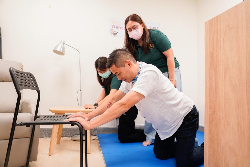 圖說:家庭照顧者在專業人員(著綠衣者)指導下,演練老人跌倒後要如何攙扶椅子安全起身。