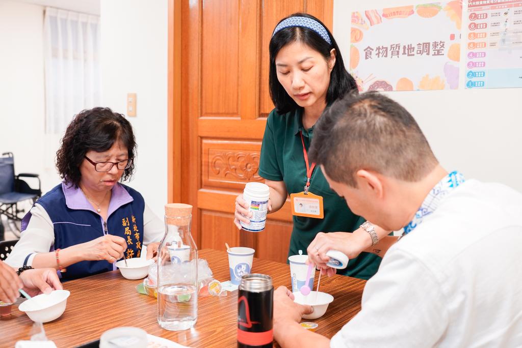 圖說:許秀能副局長(左)與家庭照顧者(右)學習使用增稠劑調整水的質地,讓長輩吞嚥更安全。