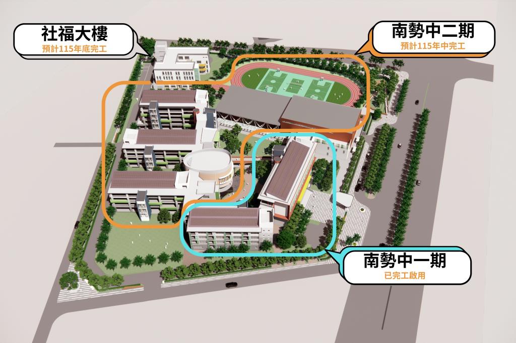 同時,校園規劃於115年底完成社福大樓,提供幼兒園、托育中心與托老中心等設施,形成從幼兒到銀髮族的全齡服務體系,實踐學校與社區共榮的教育願景。整體工程採綠建築與智慧建築雙標章設計,導入AI智慧教學系統與節能監控技術,打造智慧永續校園新典範。