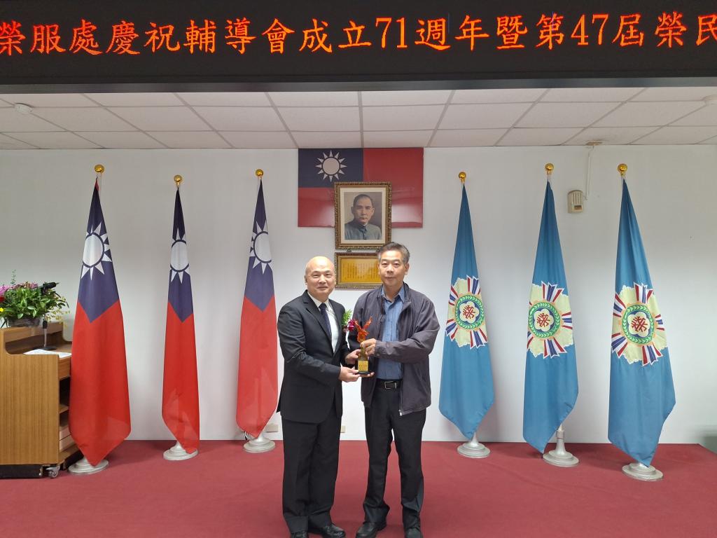 榮服處陳學良處長首先恭賀各類績優個人、社團和廠商代表,尤其感謝退伍軍人社團,長年結合辦理寒冬送暖、重陽敬老及協助訪視服務關懷榮民眷等活動,接續感謝世華機械公司、歐盛珠寶國際公司、喜互惠公司近年協助辦理職訓及就業,並多次提供工作職缺、進用榮民眷任職、穩定家庭生活之績優廠商。