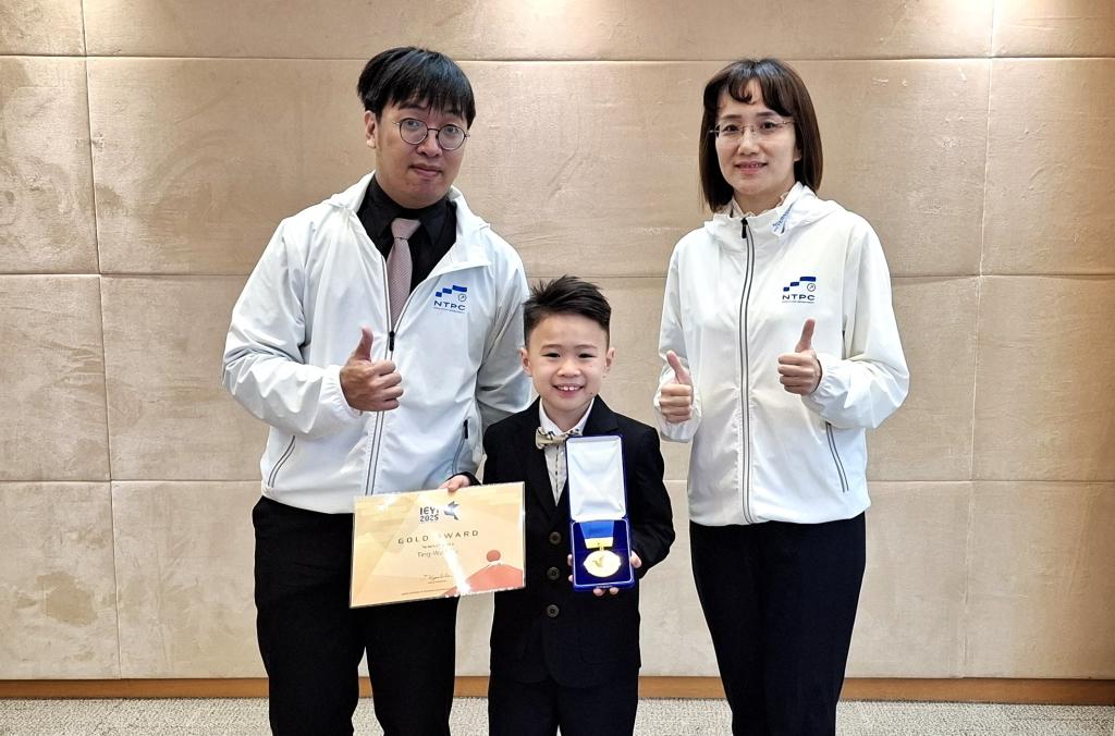 ▸育才國小張呈澤在「災害管理與安全」組別以「電扶梯防推擠安全系統」奪金,運用紅外線與影像辨識技術偵測人潮擁擠情況,能即時警示並暫停運轉,有效防止推擠與跌倒事故。