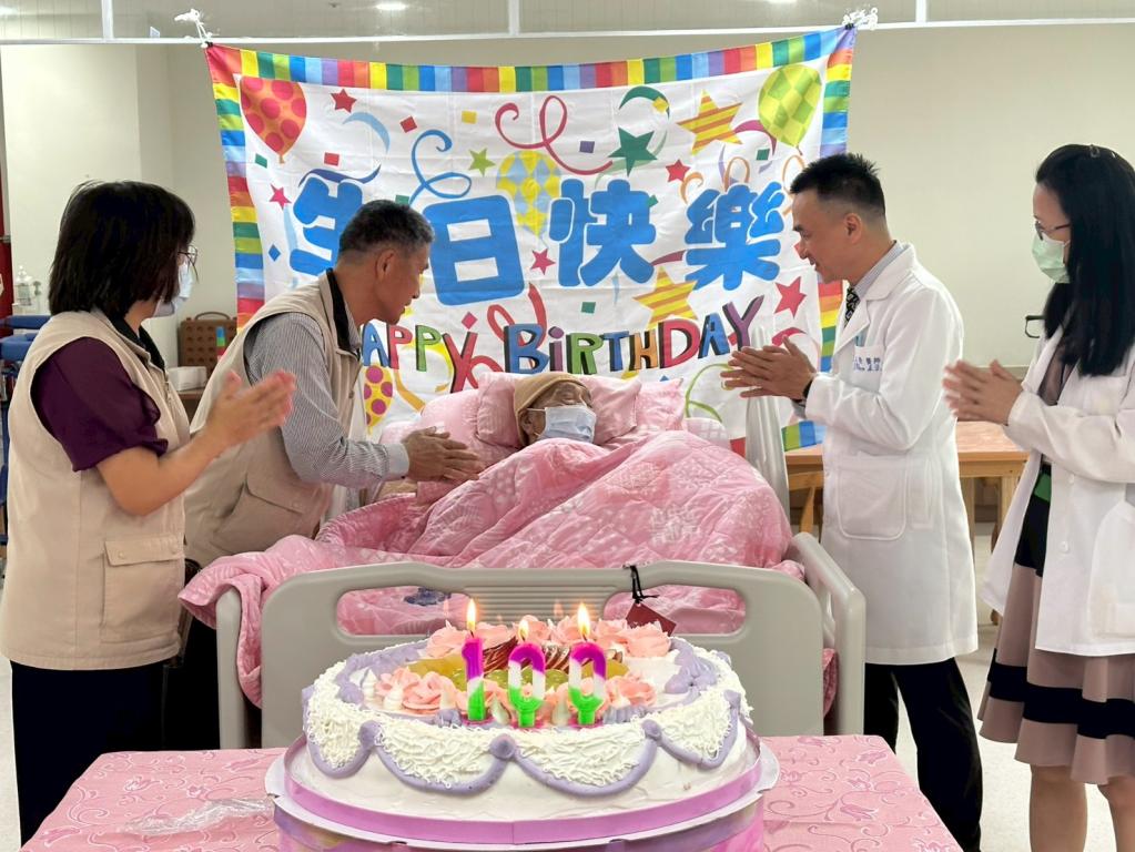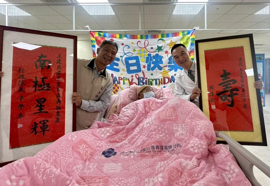 【勁報記者于郁金/嘉義報導】臺中榮民總醫院嘉義分院3日於該院附設護理之家,偕同彰化榮譽國民之家,為百歲榮民王建民爺爺舉辦百歲壽辰慶生活動,嘉榮院長陳正榮率護理團隊,與彰化榮家家主任蘇再勝及同仁一同為王爺爺祝福,一起唱〈生日快樂歌〉及〈黃埔祝壽歌〉,現場洋溢著溫馨與感恩氛圍。