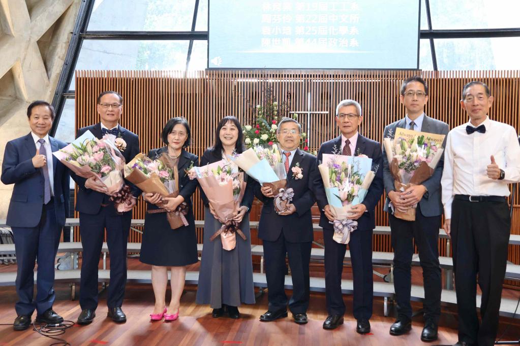 圖說:本屆6位傑出校友包括物理系陳從德、化工系鄭建新、工工系林育業、中文系周芬伶、化學系袁小琀,以及政治系校友、現任交通部長陳世凱。(東海大學提供)