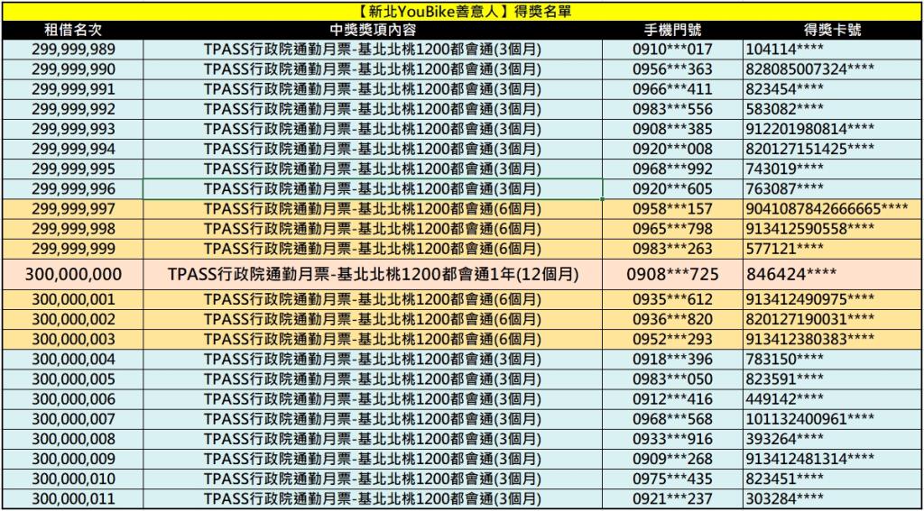 (勁報記者胡光輝/新北報導)為慶賀新北市YouBike突破3億騎乘人次,新北市交通局與微笑單車公司舉辦「尋找新北市YouBike善意人」的第3億人名單出爐了!將可獲得一年12個月份的TPASS基北北桃1200都會定期票,另包括前、後各11名中獎名單亦公布於YouBike官方網站https://activity.youbike.com.tw/prizes ,趕快上網查詢,善意人,是你嗎?