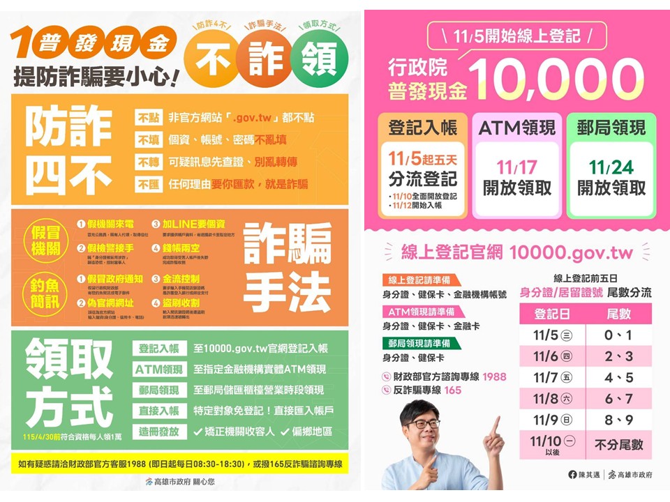 高雄市政府於11月6日召開「普發現金防詐跨局處協調會議」,整合市府「打詐高雄隊」各局處資源,針對此次普發現金領取方式多元化,詐騙集團可能利用「釣魚簡訊」或「一頁式廣告連結」詐取民眾個資及財物,要求各局處落實防詐機制,利用戶政、地政單位及各區公所佈告欄張貼海報,並在高雄捷運沿線各站月臺及候車區螢幕播放宣導影音,確保民眾快速獲取防詐資訊,全面構建機關聯防及全民識詐的堅固防線。
