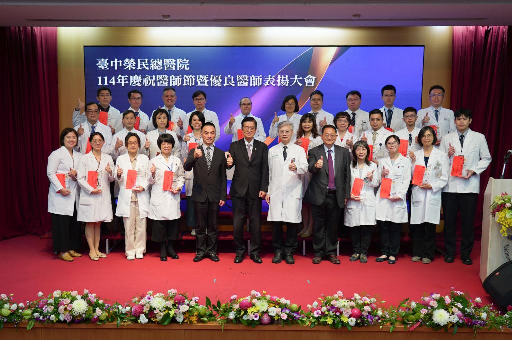 【勁報記者于郁金/嘉義報導】醫師節前夕,中榮嘉義暨灣橋分院今年共有4位醫師榮獲「114年優良醫師」殊榮,日前代表分院前往臺中榮民總醫院參加「114年慶祝醫師節暨優良醫師表揚大會」,獲獎包括肝膽腸胃科主任陳柏翰、耳鼻喉科主任邱于容、身心醫學科主任杜榮鴻、家庭醫學部洪恩琪醫師,4位醫師皆以卓越專業表現與敬業精神,獲得高度肯定,典禮由國軍退除役官兵輔導委員會主任委員嚴德發親自頒發獎項,嚴主委讚許4位醫師長期致力於臨床醫療與病人照護,充分展現榮總體系醫師專業典範與人文關懷精神。