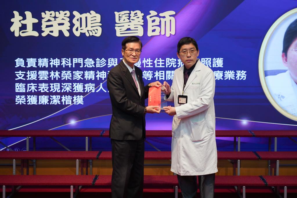 灣橋榮院身心醫學科科主任杜榮鴻,同時擔任灣橋分院精神科及兒童青少年精神科主任,具有三項專科醫師資格(精神科、兒童青少年精神科及老年精神科),業務繁重仍盡心盡力;除負責門急診與住院照護,亦支援雲林榮家精神科門診,杜主任關懷病患、視病猶親,多次獲病患家屬來函感謝,另因誠信廉潔事蹟,曾婉拒病患家屬贈款並主動回報政風室,榮獲「廉潔楷模」殊榮,堪為表率。