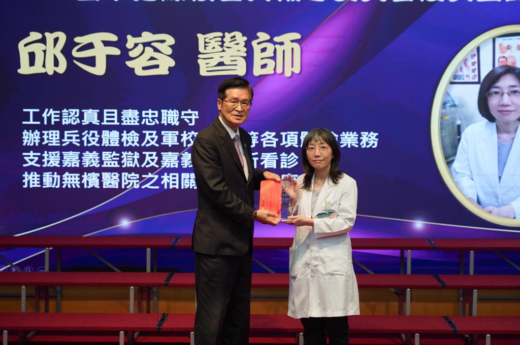 嘉義榮院耳鼻喉科科主任邱于容,長期負責耳鼻喉科臨床業務,工作認真盡責,並協助完成兵役及軍校體檢等任務,支援嘉義監獄及看守所診療;另積極推動「無檳醫院」宣導講座與社區癌症篩檢及衛教活動,深耕健康促進工作,守護民眾健康。